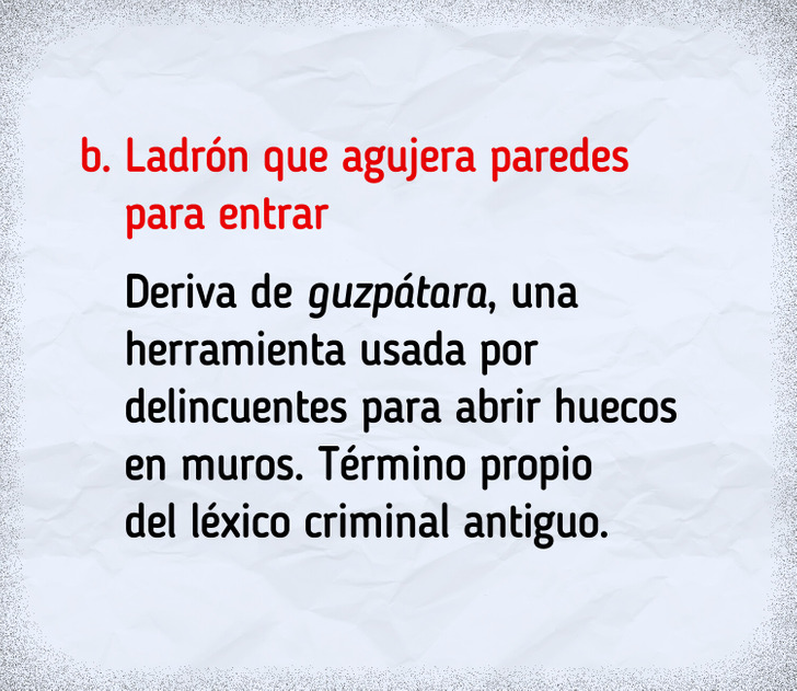 Deriva de guzpátara, una herramienta usada por delincuentes para abrir huecos en muros. Término propio del léxico criminal antiguo.