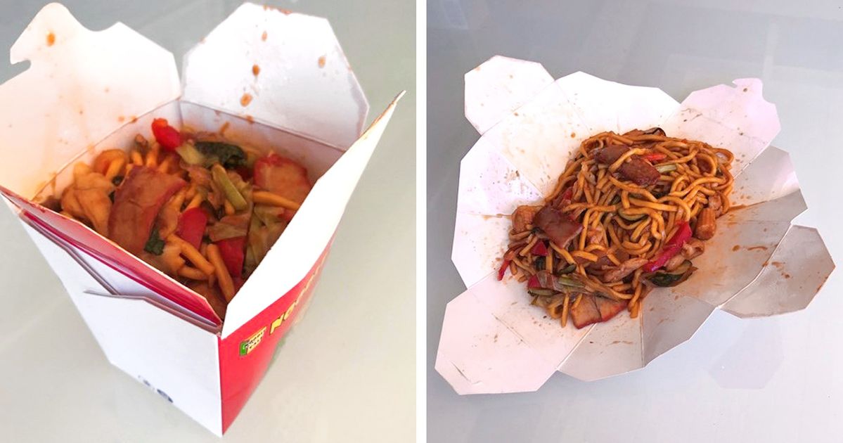 Los contenedores de comida china para llevar no son los más convenientes para comer porque a menudo son profundos y angostos. Lo creas o no, estos contenedores tienen un secreto que hará que comer sea mucho más fácil para ti. Desdobla el contenedor y se convierte en un plato.