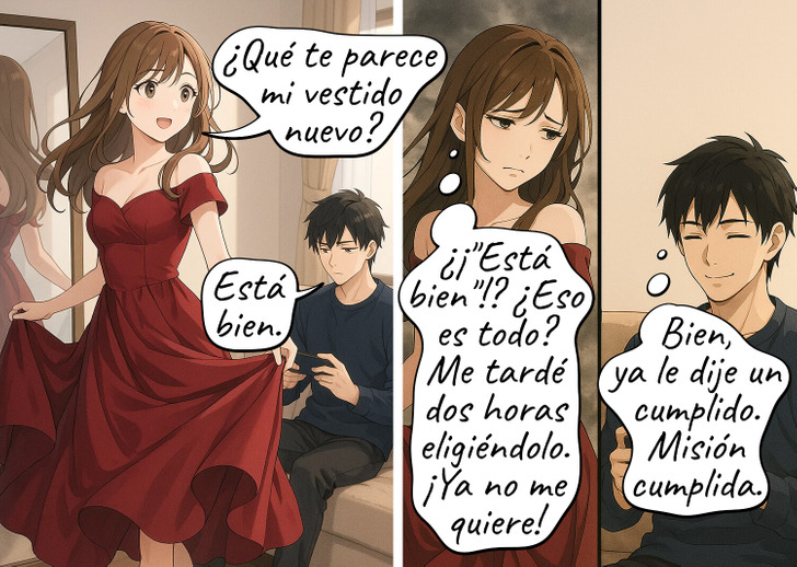 Las mujeres pueden darle vueltas a un asunto durante horas. A los hombres les basta con poco: dicen un “cumplido” y ya se sienten héroes.