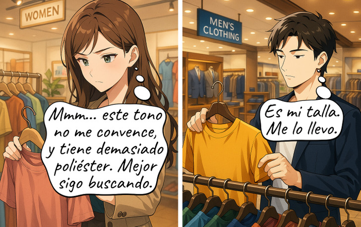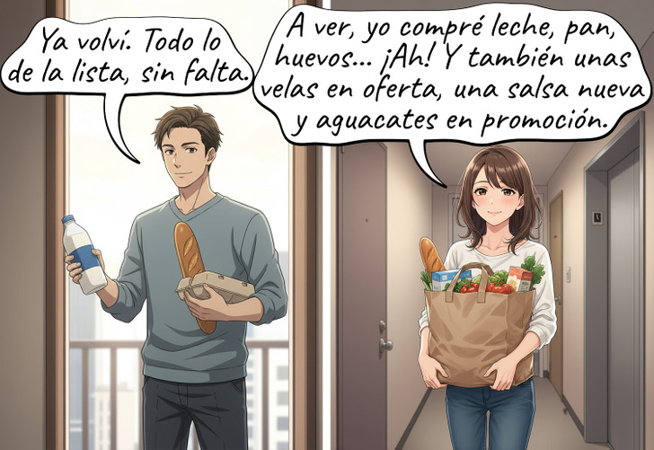 El hombre va al supermercado con una lista y compra exactamente lo que se necesita. La mujer va con la misma lista... y vuelve con un par de bolsas extra, porque “esto seguro sirve para la casa”.