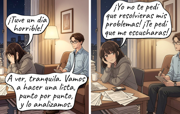 Un hombre, inmediatamente, busca la manera de ayudar y solucionar todos los problemas, mientras que a una mujer le basta con que la escuchen.