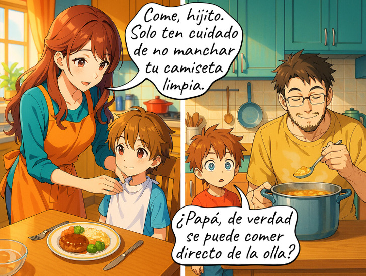 Mamá le enseña a su hijo a comer con cuidado y a seguir todas las reglas de etiqueta, pero papá tiene una manera un poco distinta de hacerlo.