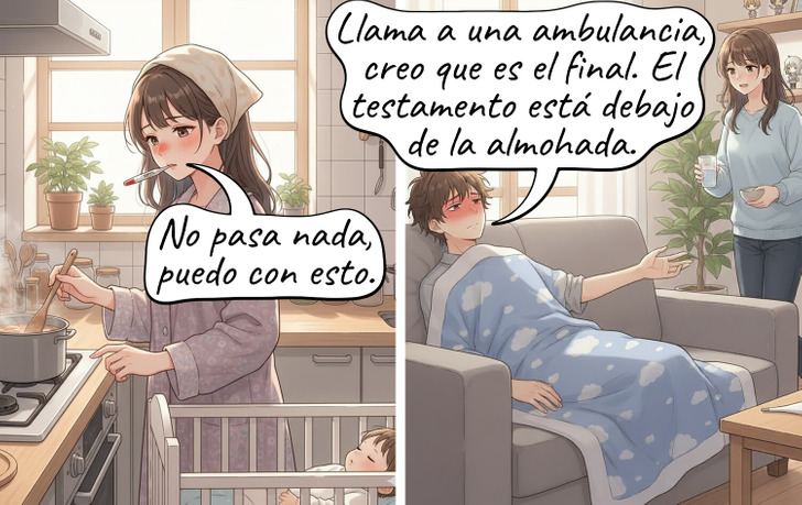 Una mujer no se olvida de sus responsabilidades ni siquiera con casi 38 de fiebre, mientras que un hombre, ante el menor malestar, ya está preparando su testamento.