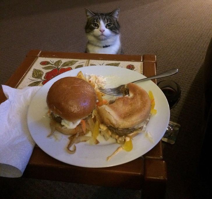5. “La última vez que mi hermano estuvo en casa se preparó unas hamburguesas y me envió esta foto de la reacción de mi gato”