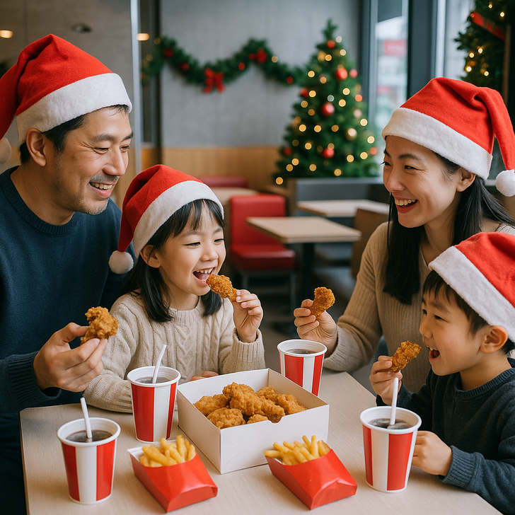 En Japón, la Navidad tiene un sabor distintivo: el de la comida rápida. Se ha vuelto costumbre en el país cenar pollo frito en Nochebuena, gracias a una fructífera campaña de marketing de Kentucky Fried Chicken (KFC) realizada en los 70. La demanda es tan alta que los pedidos y las reservas para el cubo navideño tienen que hacerse con bastante antelación, lo cual es un fenómeno culinario cultural.
