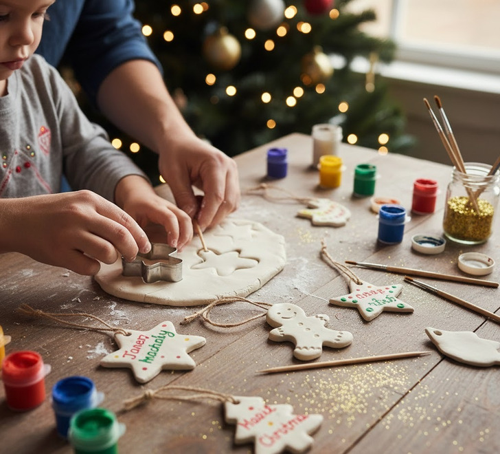 - Desarrollo: Con la ayuda de cortadores de galletas navideños (estrellas, hombres de jengibre, árboles), corta las formas después de extender la arcilla para que se seque al aire. Utiliza un palillo para perforar un pequeño orificio en la parte superior antes de que se sequen. Después de secarse (siguiendo las instrucciones del fabricante), los niños tienen la posibilidad de pintarlas y escribir su nombre, cumpliendo así la función de etiqueta para un regalo o adornos que perduren en el árbol.