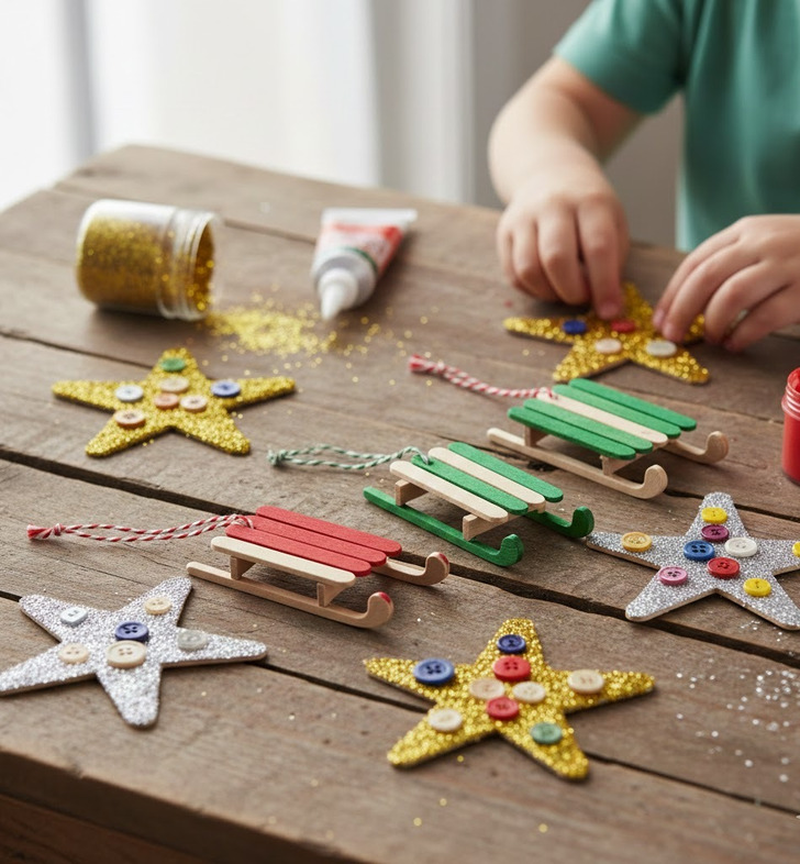 - Producción: Para construir un pequeño trineo, une dos palitos cortos en la parte inferior como patines y cuatro o cinco palitos de forma horizontal. Usando un conjunto de colores festivos (rojo, verde y blanco), pinta y agrega una pequeña porción de cordel para colgar. Para hacer una estrella, solo tienes que pegar cinco palitos, de manera que se asemejen a la silueta de una estrella de cinco picos, y adornarla con purpurina o botones.