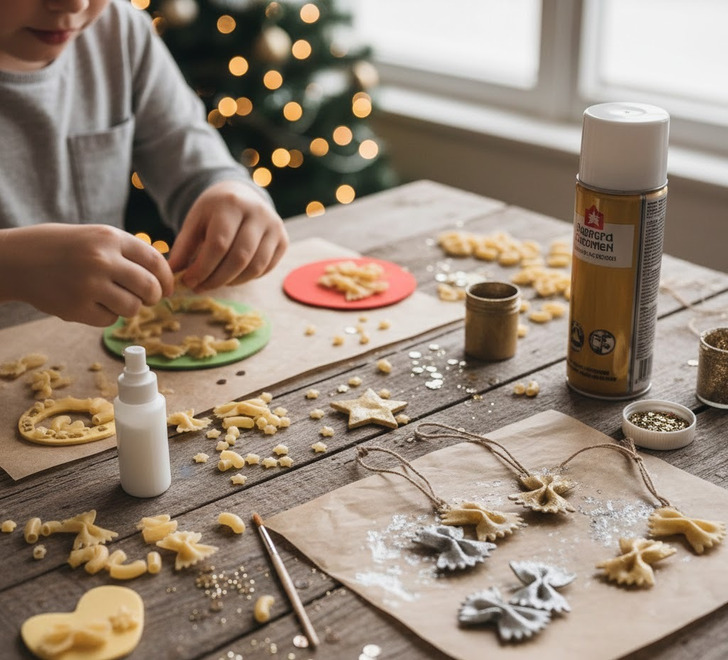 - Desarrollo: Adquiere pasta con figuras llamativas (por ejemplo, pajaritas, tubos pequeños o estrellitas). Los niños tienen la capacidad de adherirlas a cartulina o goma EVA, que previamente han sido cortadas en formas simples (como círculos o corazones), utilizando silicona líquida o pegamento resistente. Una vez que estén secas, la guinda del pastel es pintar el adorno con pintura en spray dorada o plateada (siempre lo debe hacer un adulto). Finalmente, se les pone un hilo para que las cuelguen del árbol.