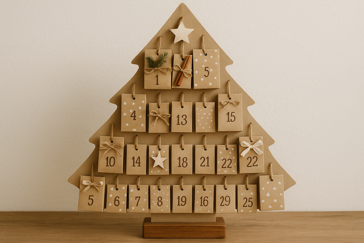 - Desarrollo: Recorta un soporte de cartón grueso con la forma de un árbol navideño. Elabora 24 bolsitas o sobres de papel kraft y asígnales un número del uno al veinticuatro. Coloca las bolsitas en la base del árbol, pegándolas o perforándolas, y distribúyelas simétricamente. Los niños tienen la posibilidad de adornar las bolsitas con elementos simples (como ramas de canela, sellos de estrellas y cintas de cuerda) y, por supuesto, decidir qué pequeñas golosinas o mensajes sorpresas se esconderán en su interior.