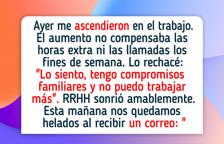 Soy mujer de 38 años. Ayer me ascendieron en el trabajo. La paga extra no merece la pena por el horario más largo y las llamadas de fin de semana que tendría que atender. Así que lo rechacé diciendo: “Lo siento, tengo obligaciones familiares y no puedo trabajar más”. RRHH se limitó a sonreír amablemente. Esta mañana, imagínate mi sorpresa cuando llegué a la oficina y encontré un gran cartel en la pared con un lema: “¡Trata tu trabajo como a tu familia!”.